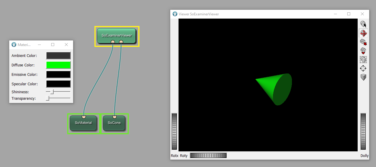 Open Inventor modules are executed like scene graphs. This means modules are traversed from top to bottom and from left to right. Here, it is important to connect the module SoMaterial to an input on the left side of the connection between SoCone and SoExaminerViewer. With this, we first select features like a color and these features are then assigned to all objects, which were executed afterward. Now, open the panel of the module SoMaterial and select any Diffuse Color you like. Here, we choose green.