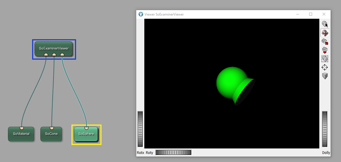 In order to do that, add the module SoSphere to the workspace. Connect this module to SoExaminerViewer. When connecting SoSphere to an input on the right side of the connection between the viewer and the module SoMaterial, the sphere is also colored in green. One problem now is that currently both objects are displayed at the same position.