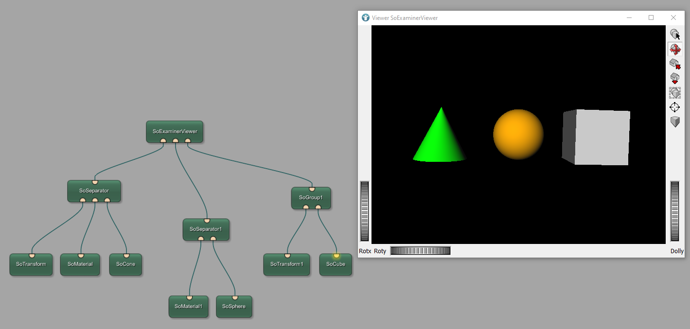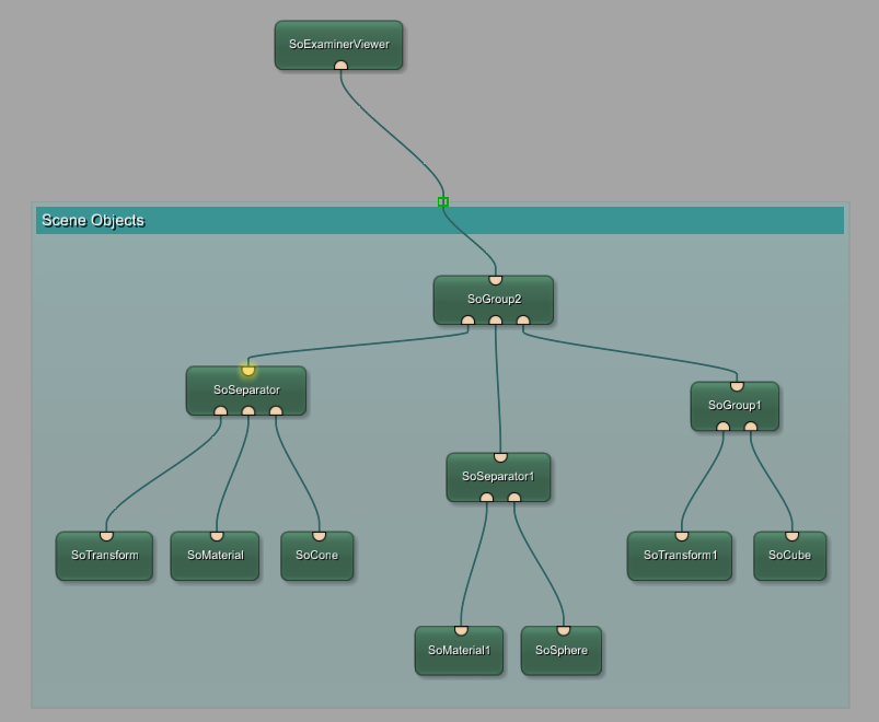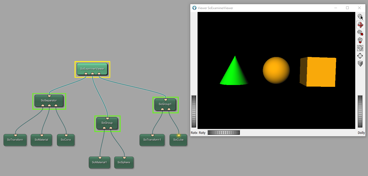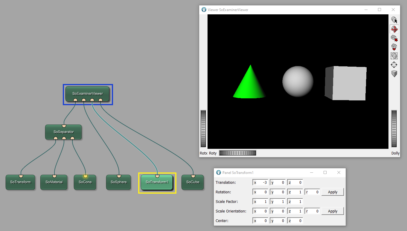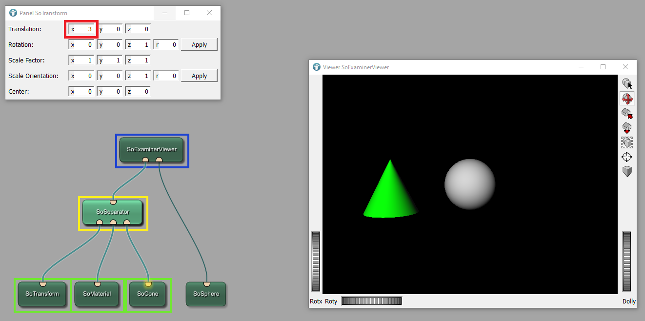 The module SoTransform is responsible for shifting objects, in this case the cone, to the side. The module SoSeparator ensures that only the cone is shifted and also only the cone is colored in green. It separates this features from the rest of the scene.