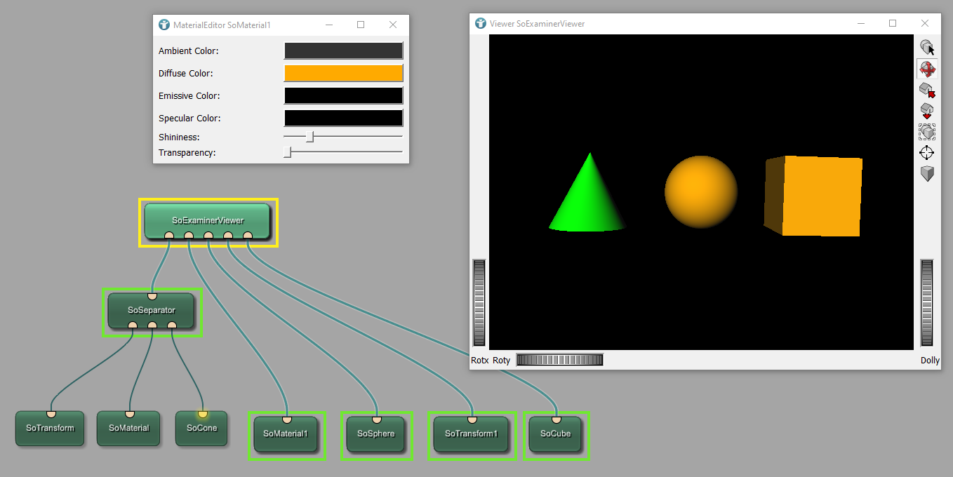 Again, we use the module SoMaterial to select a color for the cone and the sphere.