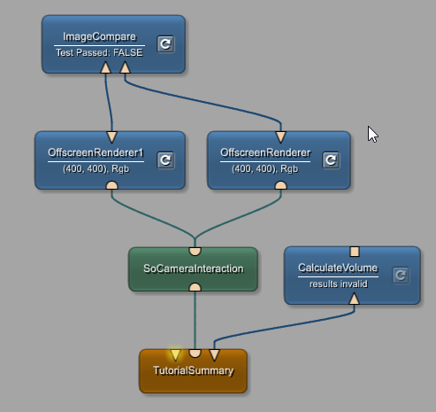 You can now add a viewer or any other module to your macro module and use them for testing. In our example, we add a CalculateVolume module to the segmentation mask and a SoCameraInteraction with two OffscreenRenderer modules to the 3D output. In the end, we need an ImageCompare module to compare expected and real image in our test.