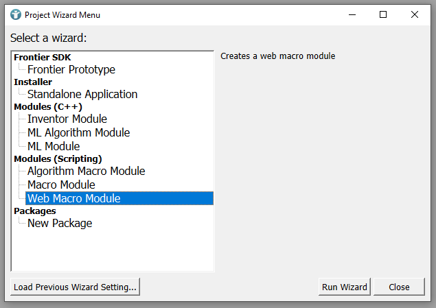 Open Project Wizard via [ File → Run Project Wizard... ] and select Web Macro module. Run the Wizard and enter details of your new macro module.