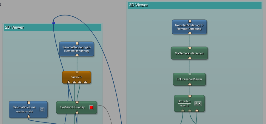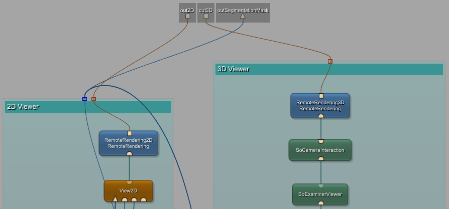 We are going to develop a web application; therefore, we need special RemoteRendering modules for the viewer. Add two RemoteRendering modules and a SoCameraInteraction to your workspace and connect them to your existing modules as seen below.