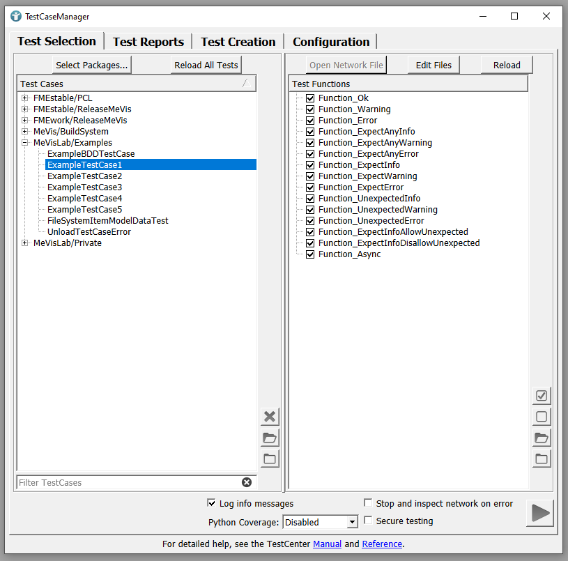 On the right side of the Test Selection tab, you can see a list of functions in the test case. Each list entry is related to a Python function. You can select the functions to be executed. If your test case contains a network, you can open the .mlab file or edit the Python file in MATE.