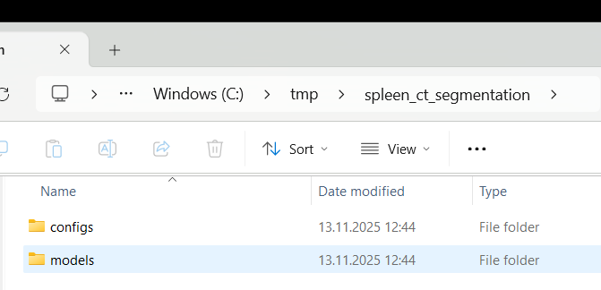 Create a folder named spleen_ct_segmentation somewhere on your system. Inside this folder, create two subfolders, one named configs and another named models, and remember their paths.