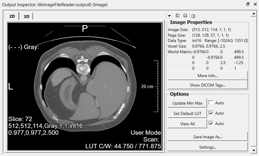 Use the itkImageFileReader module to load the file Task09_Spleen/Task09_SpleenimagesTr/spleen_7.nii.gz from dowloaded example patients. The Output Inspector shows the image and additional information about the size.