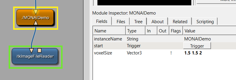 If you reload your module now, we can set the voxel size to use for the segmentation directly in our macro module MONAIDemo. Additionally, we can trigger a start function for running the segmentation. This is implemented later.