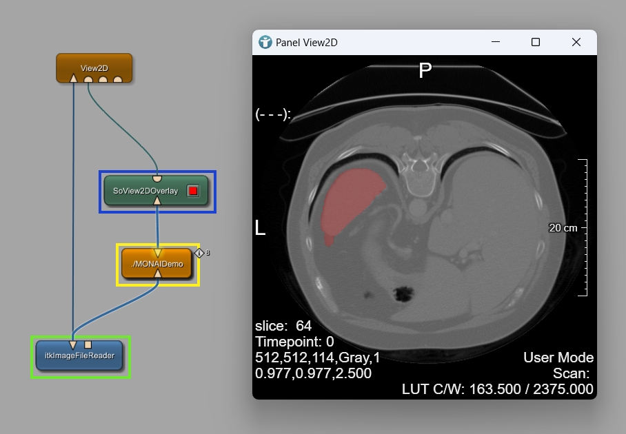 Connect the module to your local macro module MONAIDemo. The result of the segmentation shall be visualized as a semitransparent overlay on your original image.