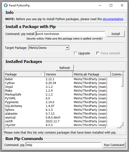 The panel shows all currently installed Python packages including their version and the MeVisLab package they are saved in. You can see a warning that the target package is set to read-only in the case you are selecting a MeVisLab package. Changing to one of your user packages (see Example 2.1: Package Creation for details) makes the warning disappear.