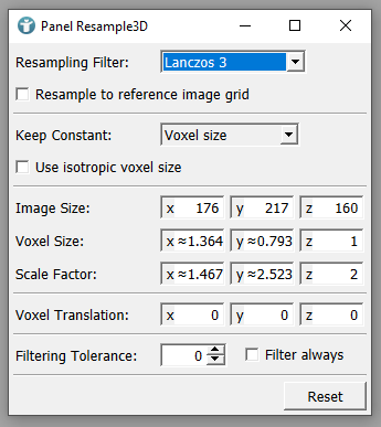 Add a LocalImage module to your workspace and select the file MRI_Head.dcm. For PyTorch, it is necessary to resample the data to a defined size. Add a Resample3D module to the LocalImage and open the panel. Change