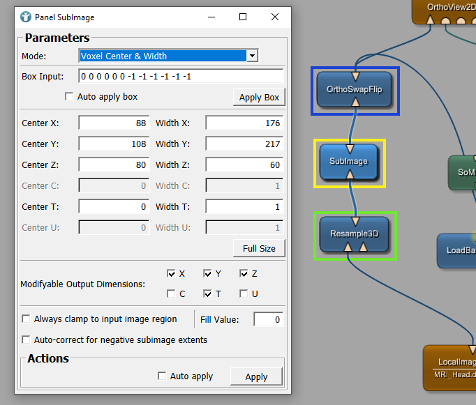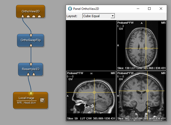 The coordinates in PyTorch are also a little bit different than in MeVisLab; therefore, you have to rotate the image. Add an OrthoSwapFlip module and connect it to the Resample3D module. Change