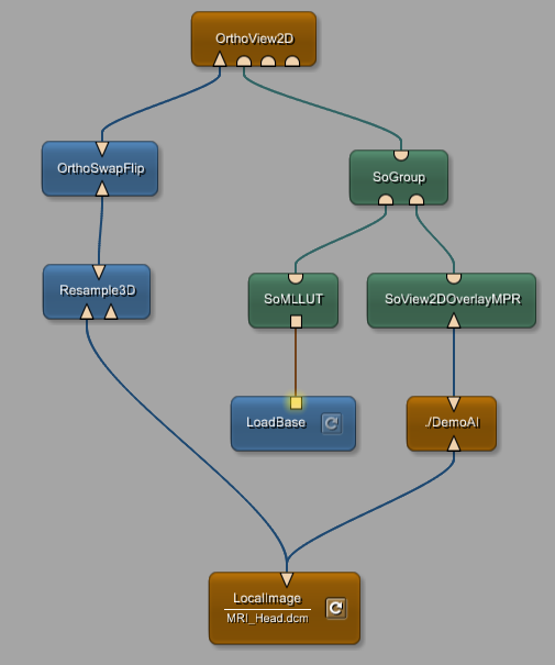 We want to show the segmentation results as an overlay on the original image. Add a SoView2DOverlayMPR module and connect it to your DemoAI macro. Connect the output of the SoView2DOverlayMPR to a SoGroup. We also need a lookup table for the colors to be used for the overlay. We already prepared an .xml file you can simply use. Download the lut.xml file and save it in your current working directory of the project.
