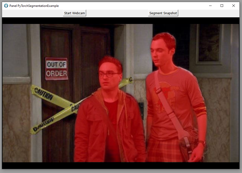 The final result of the segmentation should be a semitransparent red overlay of the persons segmented in your webcam stream.