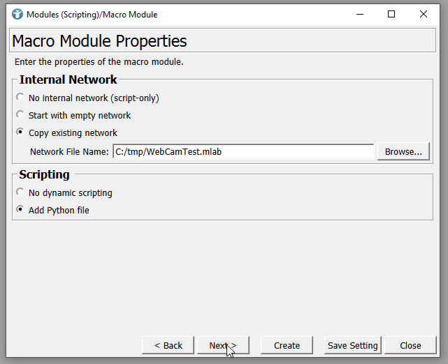 Define the module properties and select the copied .mlab file. Make sure to add a Python file and click