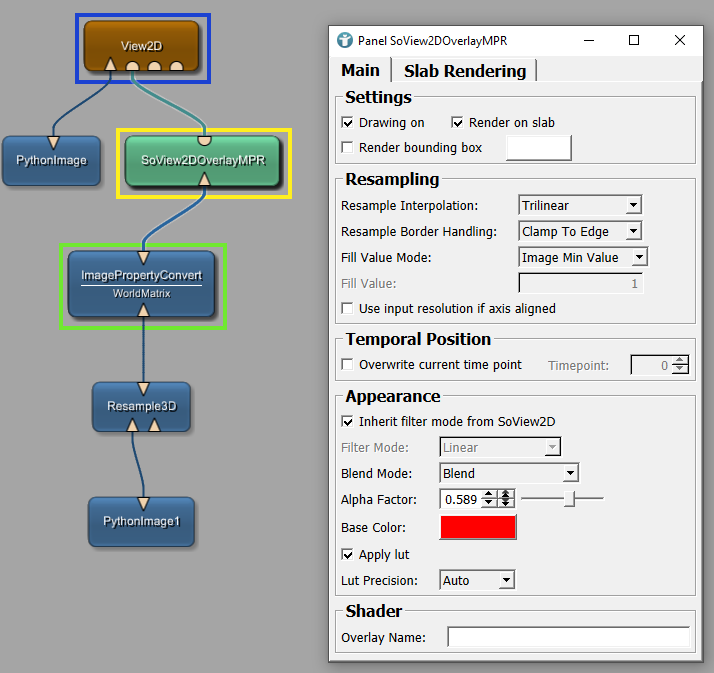 Then, add a SoView2DOverlayMPR module and connect it to the ImagePropertyConvert and the View2D. Change