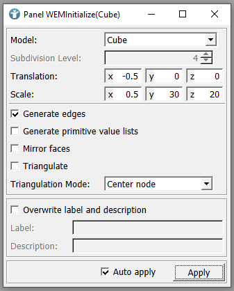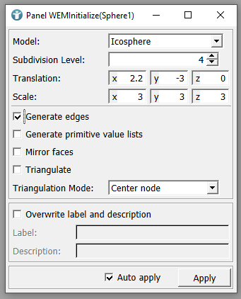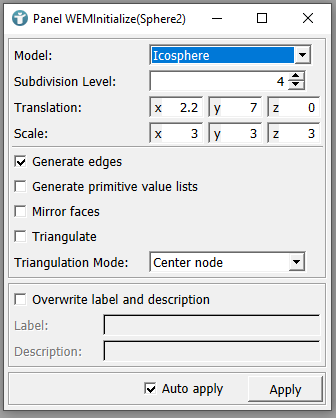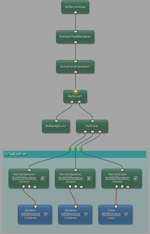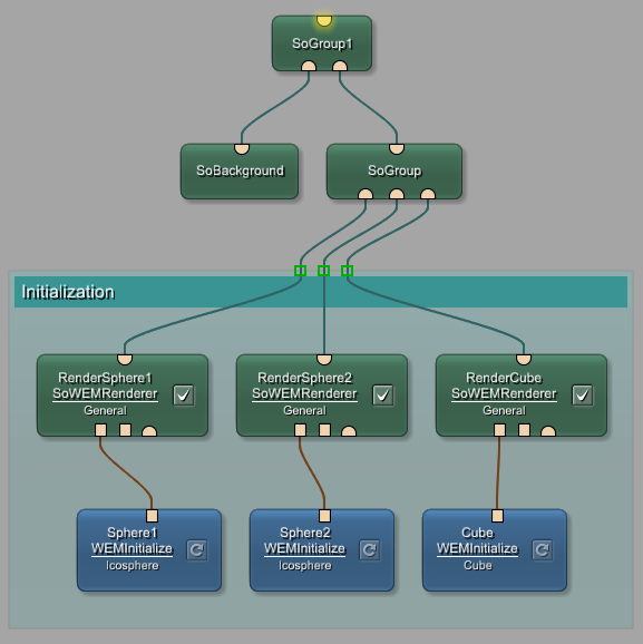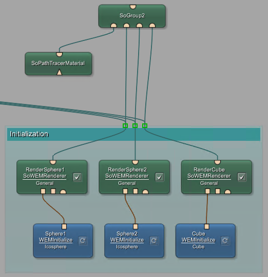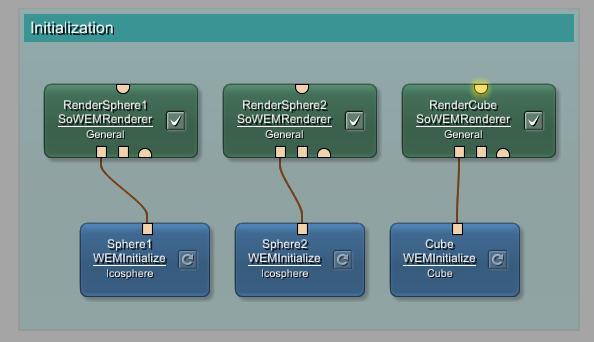 Add three WEMInitialize modules for one Cube and two Icosphere to your workspace and connect each of them to a SoWEMRenderer. Set WEMInitialize modules to Cube, Sphere1, and Sphere2. Set SoWEMRenderer modules to and RenderCube, RenderSphere1, and RenderSphere2.
