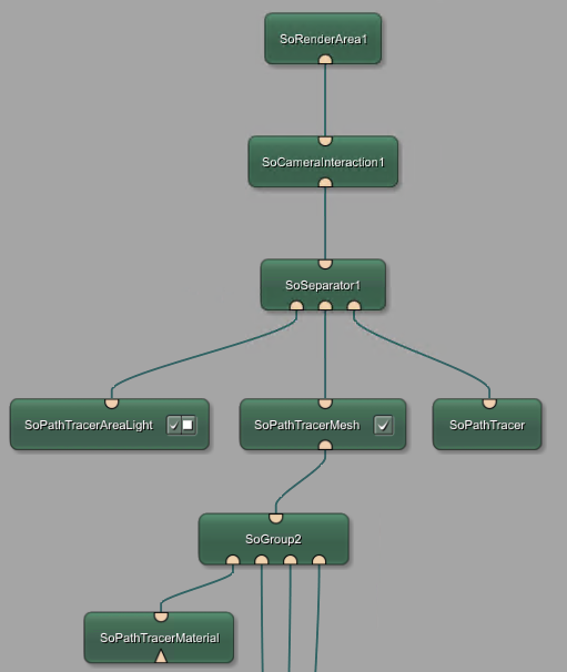 Add a SoPathTracerAreaLight, a SoPathTracerMesh, and a SoPathTracer to a SoSeparator and connect the SoPathTracerMesh to your SoGroup. This adds your 3D objects to a path tracer scene.