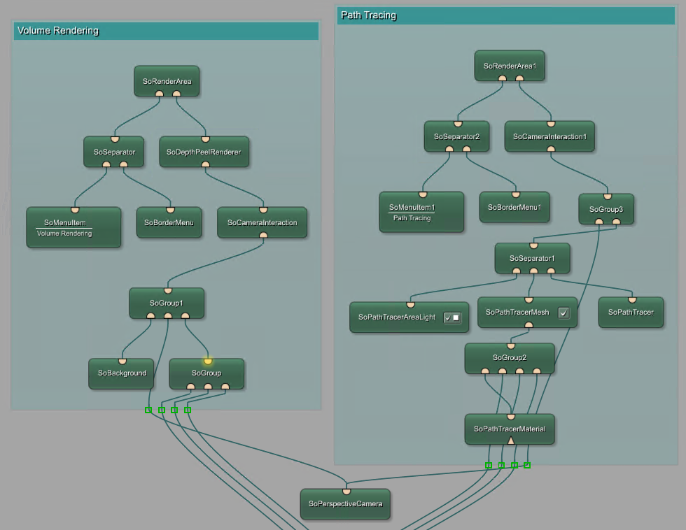 Finally, you want to have the same camera perspective in both viewers, so that you can see the differences. Add a SoPerspectiveCamera module to your workspace and connect it to the volume rendering and the path tracer network. The Path Tracer network additionally needs a SoGroup, see below for connection details. You have to trigger SoCameraInteraction modules in order to synchronize the view for both SoRenderArea viewers.