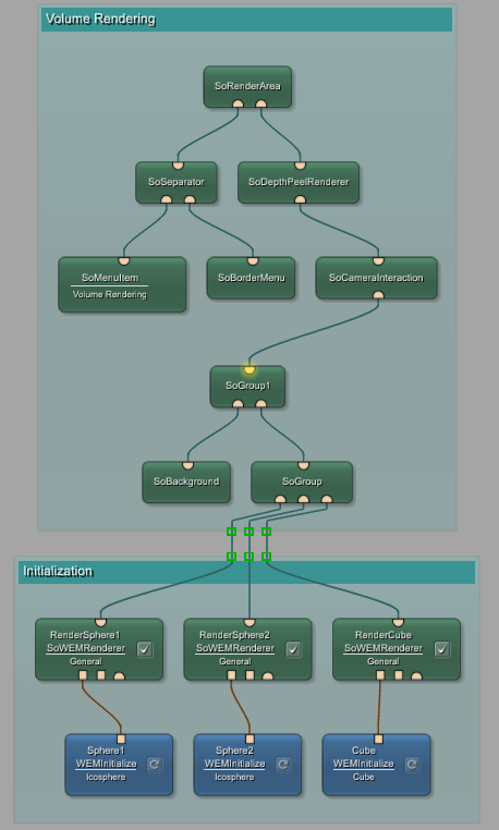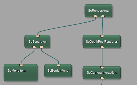 For the viewer, you now add a SoCameraInteraction, a SoDepthPeelRenderer, and a SoRenderArea module to your network and connect them.