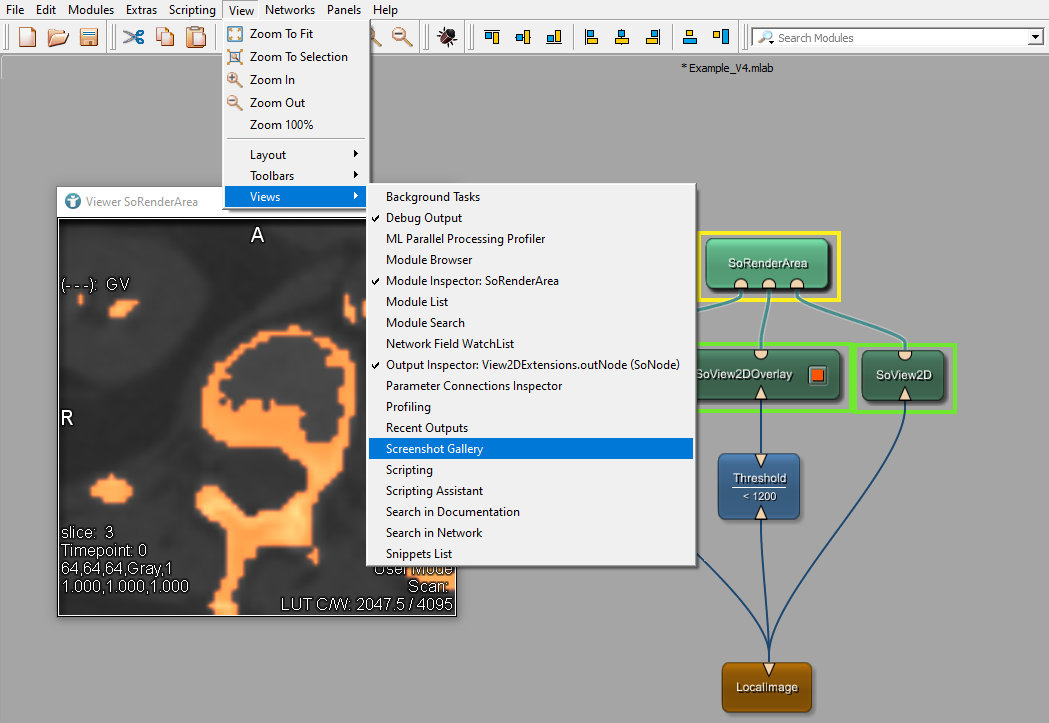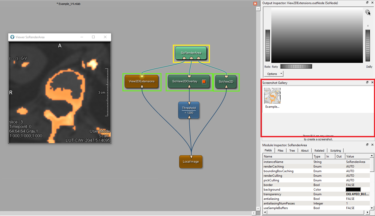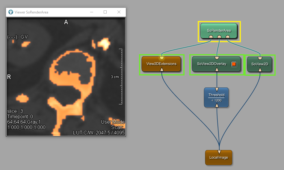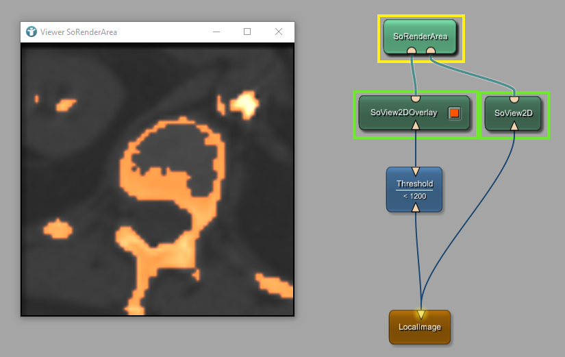 We will start the example by creating an overlay again. Add the following modules and connect them as shown. Select a Threshold as in the previous example. The module SoView2D converts the image slice(s) into a texture. The image as well as the overlay is rendered and displayed by the module SoRenderArea.