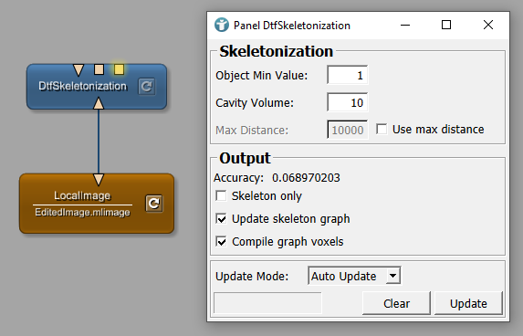 Load the example tree mask by using the LocalImage module. Connect the output to a DtfSkeletonization module as seen below. The initial output of the DtfSkeletonization module is empty. Press the