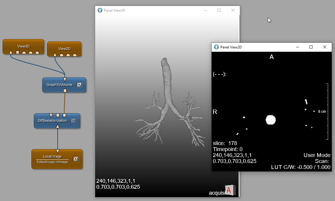 The output DtfSkeletonization.outBase1 shows nothing. Here you can find the three-dimensional graph of the vascular structures. To generate it, open the panel of the DtfSkeletonization module, set
