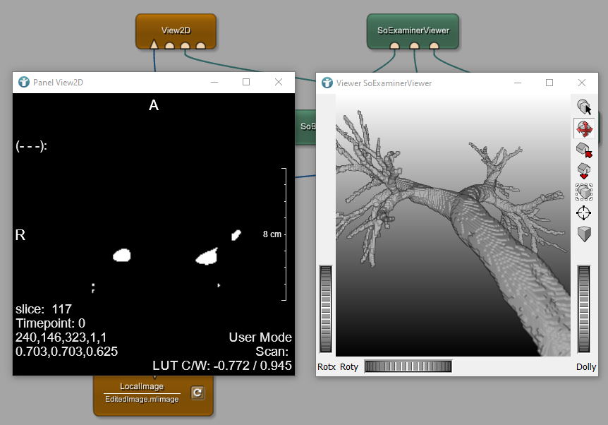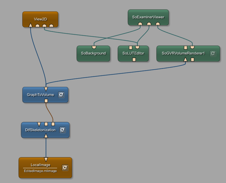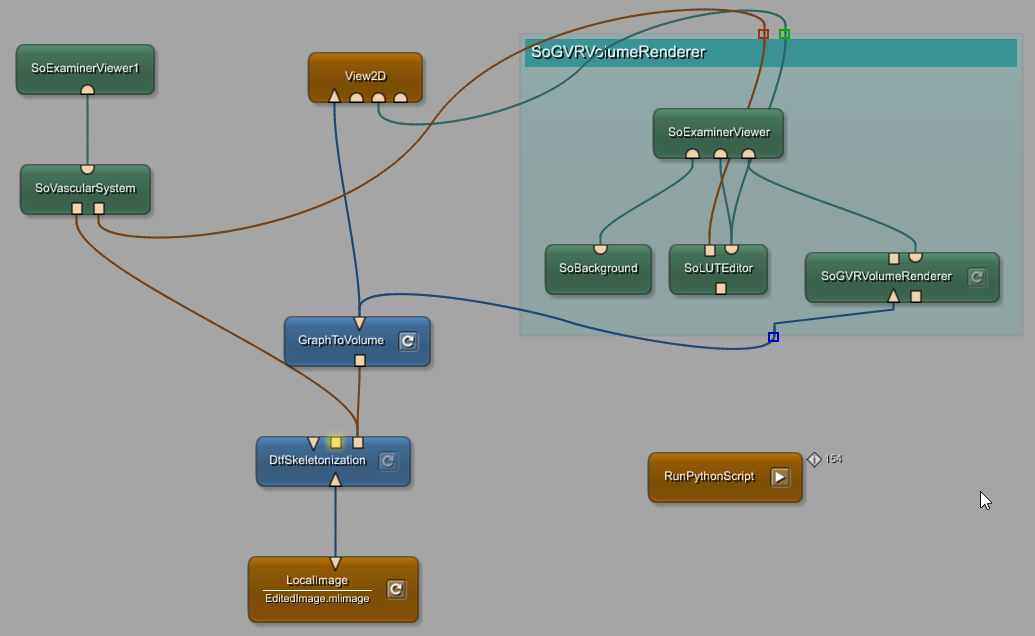 Add a SoVascularSystem module to your workspace. Connect it to your DtfSkeletonization module and to the SoLUTEditor as seen below. Add another SoExaminerViewer for comparing the two visualization. The same SoBackground can be added to your new scene.