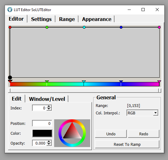 We now want the edge ID to be used for coloring each of the skeletons differently. Open the Panel of the SoLUTEditor and select tab Range. Define
