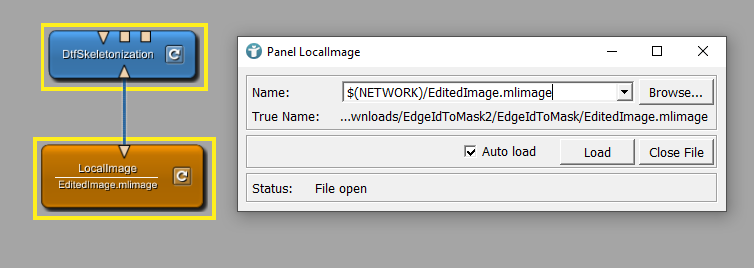 Below you can see the output of the original image taken from the LocalImage module (left) compared to the output after calculating the skeleton via DtfSkeletonization module (right).