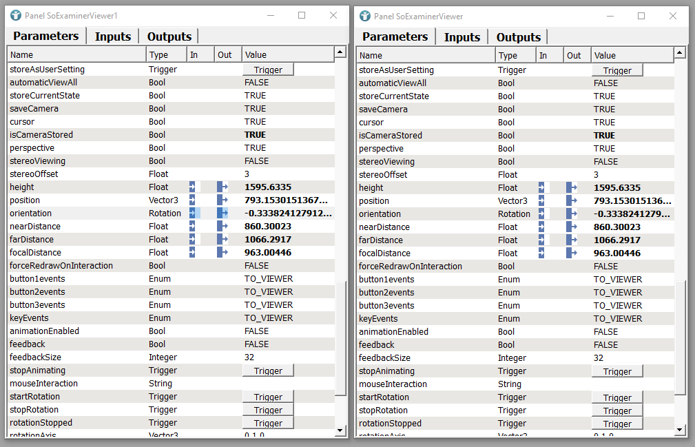 SyncFloat module. For fields containing vector, the appropriate connection can be achieved using the SyncVector module.Camera interactions are now synchronized between both SoExaminerViewer modules.